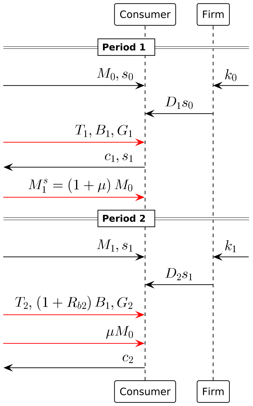 第1期与第2期之问的货币增长率为 \(\mu\) 。政府以一次总付转移支付的形式将增发货币所获得的铸币税支付给居民。
